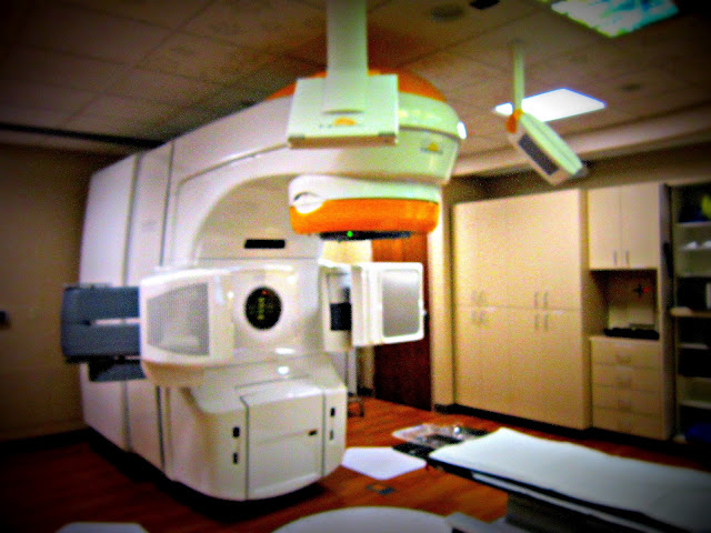 This is the radiation suite where the Novalis radiosurgery machine sits. I had the targeted 1 time treatment to my brain in this suite last Wednesday. On Monday I started treatment to the spot in my spine, in the same room. The first day took about 15 minutes or so. But by yesterday I was out in under 10 minutes. The photos are fuzzy, but I didn't want to tie up the machine too long so I snapped three quick shots before I had to have my treatment.